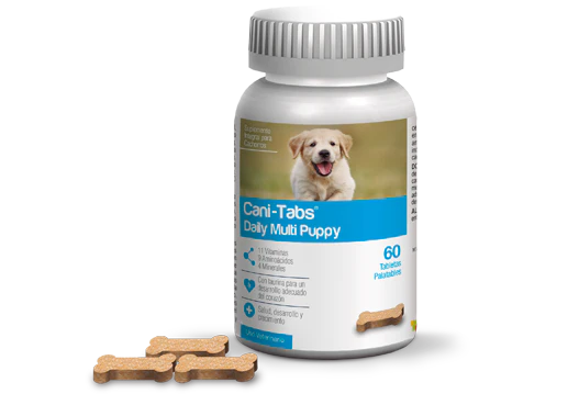 Cani Tabs Daily Multi para cachorros son comprimidos suplementarios especialmente formulados para brindar un soporte nutricional completo durante la etapa de crecimiento de tu perro joven. Estos comprimidos contienen una mezcla equilibrada de vitaminas y minerales esenciales que respaldan el desarrollo óseo, muscular y general de tu cachorro. Además, contribuyen al fortalecimiento del sistema inmunológico y promueven una piel saludable y un pelaje lustroso. Los Cani Tabs Daily Multi para cachorros son fáciles de administrar y aseguran que tu mascota esté recibiendo los nutrientes necesarios para crecer fuerte y saludable. Con estos comprimidos, estás proporcionando un respaldo nutricional completo para el desarrollo óptimo de tu cachorro.