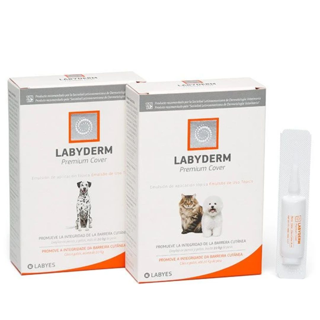 Labyderm Premium Cover Ampolla Regeneradora repara el daño causado por rayos UV, polución, sustancias químicas y otras agresiones externas que la piel de tu mascota recibe a diario. LABYDERM® Premium Cover ampolla regeneradora nutre y repara en profundidad la barrera cutánea. » Protege y rescata del daño devolviendo el aspecto de una piel saludable. » Cuida, restituye y preserva la integridad e la barrera cutánea. » Previene la resequedad de la piel por su alto contenido de ceramidas y proceramidas. Indicaciones: Ampolla de 2ml: gatos y/o perros hasta 20kg Ampolla de 4ml: perros de más de 20kg *Aplicar sobre 3 puntos distintos a lo largo del dorso del animal, directamente sobre la piel.